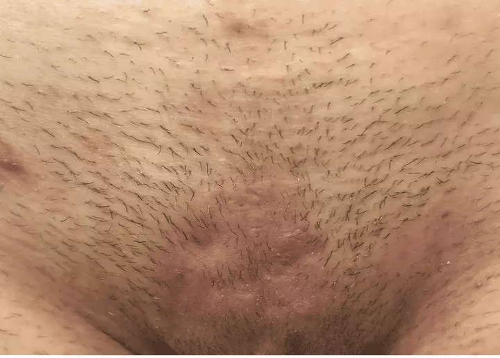 Grzybica pachwin jest wywoływana głównie przez Epidermophyton floccosum [7] lub przez inne dermatofity (takie jak Trichophyton rubrum, który w niektórych pracach zostaje przedstawiony jako najczęstszy czynnik etiologiczny [25], czy T. mentagrophytes). Grzybica pachwin objawia się zazwyczaj jako ogniska rumieniowo-złuszczające, szerzące się obwodowo, z większym nasileniem wystąpienia stanu zapalnego na obwodzie, na którym mogą występować grudki i pęcherzyki (ryc. 2) [7, 8].
