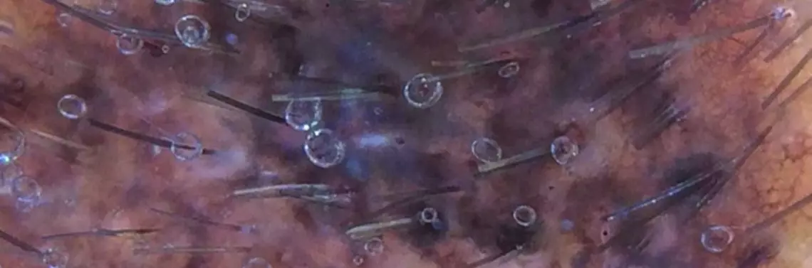 W artykule przedstawiono metodę, opisując obraz dermatoskopowy trzech czerniaków owłosionej skóry głowy.