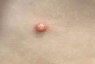 Chłopiec (dziewięć lat) zgłosił się z rodzicami do poradni dermatologicznej z powodu zmiany skórnej zlokalizowanej na bocznej powierzchni tułowia, obecnej od mniej więcej dwóch tygodni. W badaniu dermatologicznym stwierdzono obecność kopulastej, różowawej grudki o średnicy 4 mm, wypełnionej białawą treścią, z delikatnym, centralnym pępkowatym zagłębieniem, otoczonej niewielkim rąbkiem zmienionej zapalnie skóry. Pozostałe okolice ciała były wolne od zmian chorobowych. Na podstawie obrazu klinicznego rozpoznano mięczaka zakaźnego. Zalecono miejscową aplikację płynu zawierającego 5-proc. wodorotlenek potasu z uwagi na bezbolesny charakter leczenia. W trakcie wizyty kontrolnej po upływie dwóch tygodni stwierdzono obecność złuszczania w miejscu po obserwowanym wykwicie mięczaka zakaźnego.